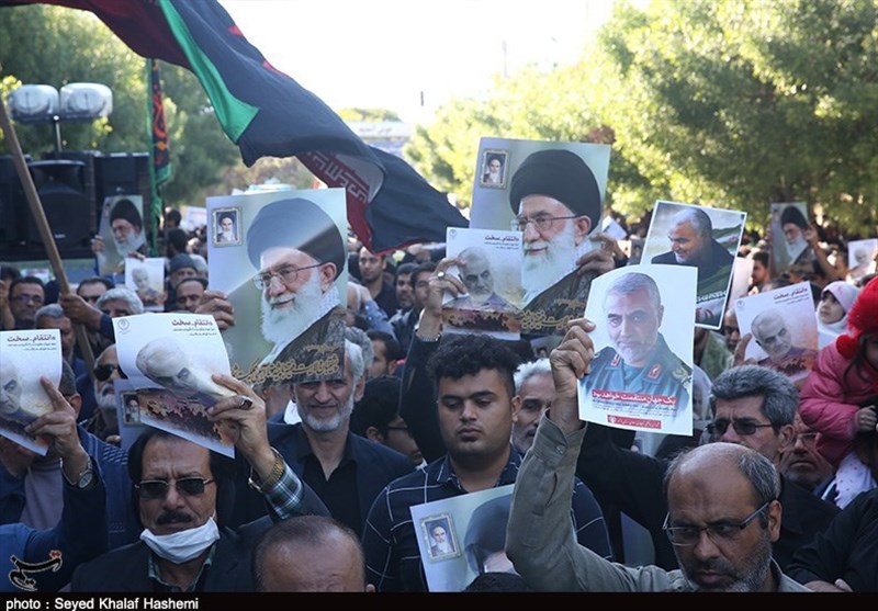 در این مراسم شرکت کنندگان برای انتقام سخت از خون شهید قاسم سلیمانی و برخورد قاطع با تروریست‌های آمریکایی تاکید کردند.