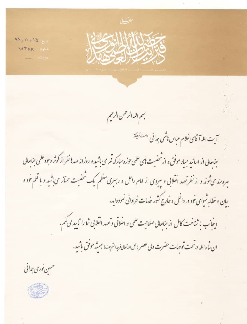 اینجانب با شناخت کامل از جنابعالی صلاحیت علمی و اخلاقی و تعهد انقلابی شما را تایید میکنم.