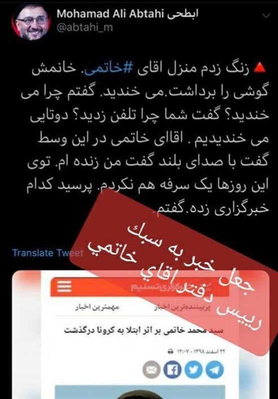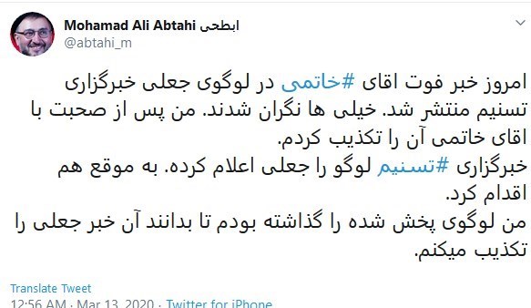 این درحالیست که همچنان که تسنیم ساعتی پیش از توییت اقای ابطحی رسماً تکذیب کرده بود، این خبر دروغ نیز مثل چندین خبر دیگر این روزها به نام رسانه ها و اشخاص جعل میشود و در این مورد نیز به دروغ اعلام شده بود که خبر فوت اقای خاتمی بر اثر کرونا را تسنیم و فارس و اعتماد منتشر کرده اند.