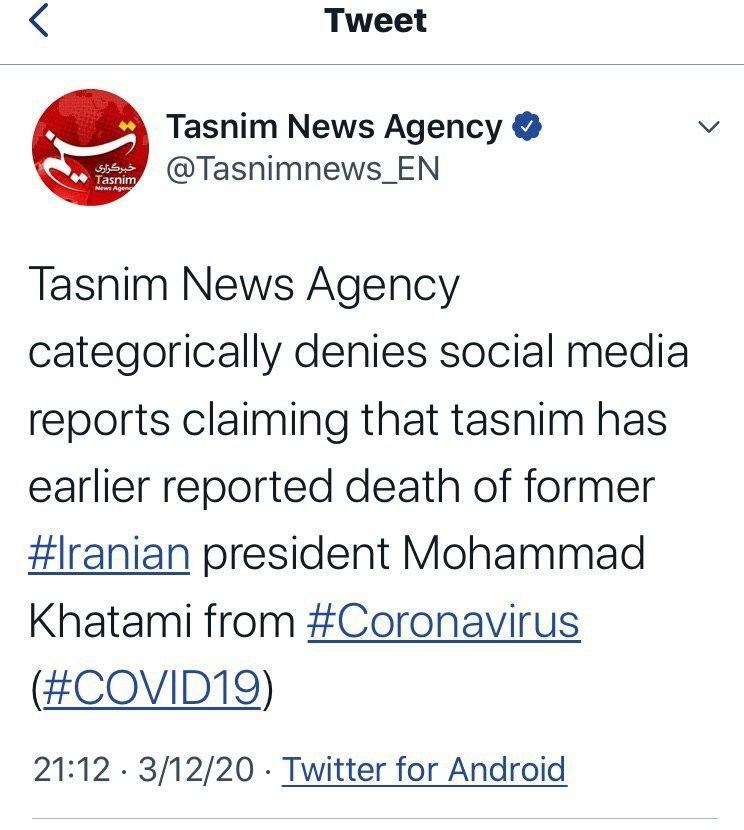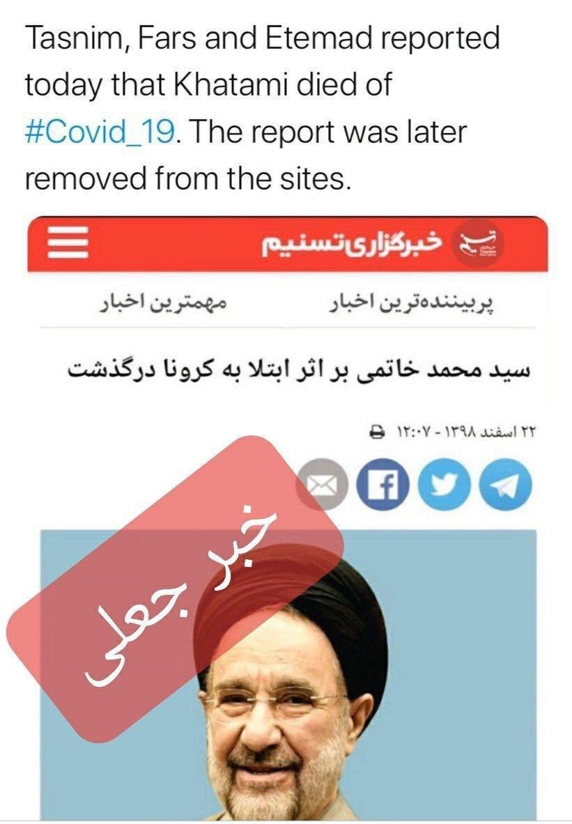 اکانت توئیتر خبرگزاری تسنیم عصر امروز رسماً اعلام کرد که خبر فوت اقای خاتمی بر اثر کرونا جعلی است و تسنیم هیچگاه چنین خبری منتشر نکرده است