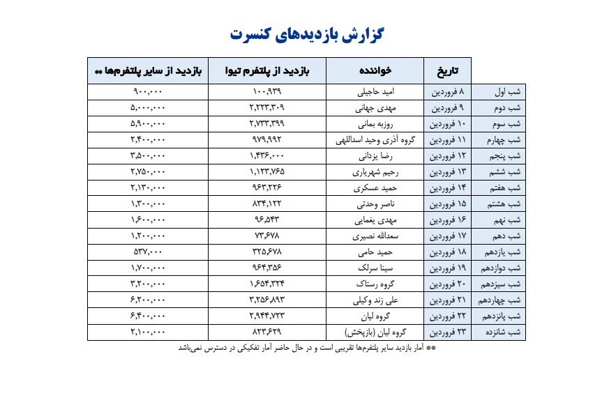 کنسرت روزبه بمانی با بیش از 8 میلیون بازدید کننده و کنسرت مهدی جهانی با بیش از هفت میلیون بازدید کننده؛ از پربینندههای کنسرت آنلاین بودهاند.