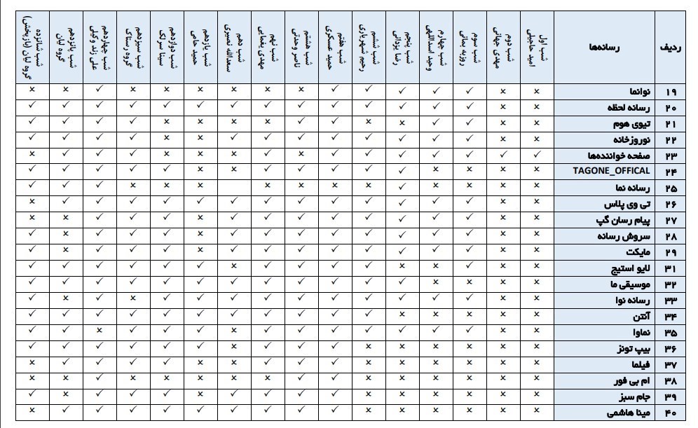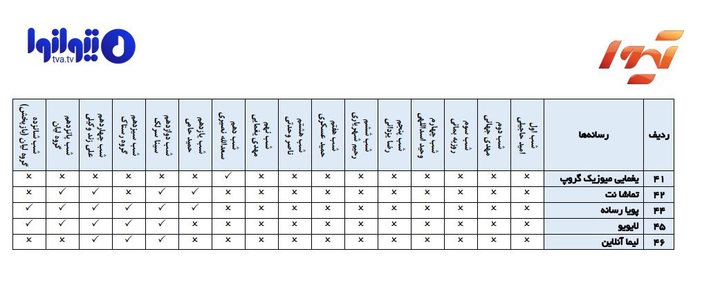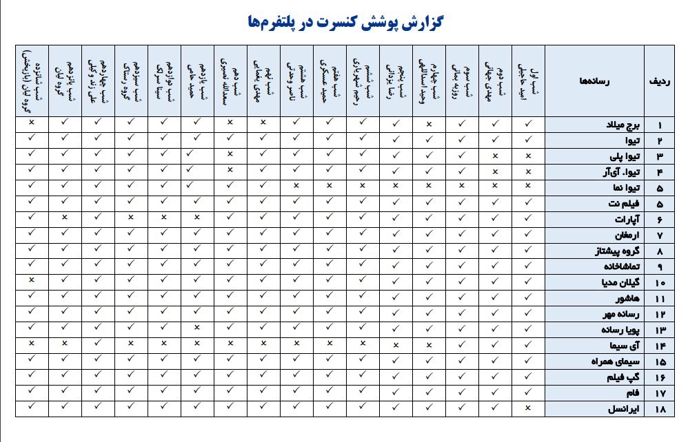 در ادامه لیست تمام پلتفرمهایی که علاوه بر تیوا، کنسرتهای آنلاینِ «نوروزخانه» را پوشش دادهاند ارائه میشود. این لیست هم از طرف شبکه تیوا ارائه شده است.