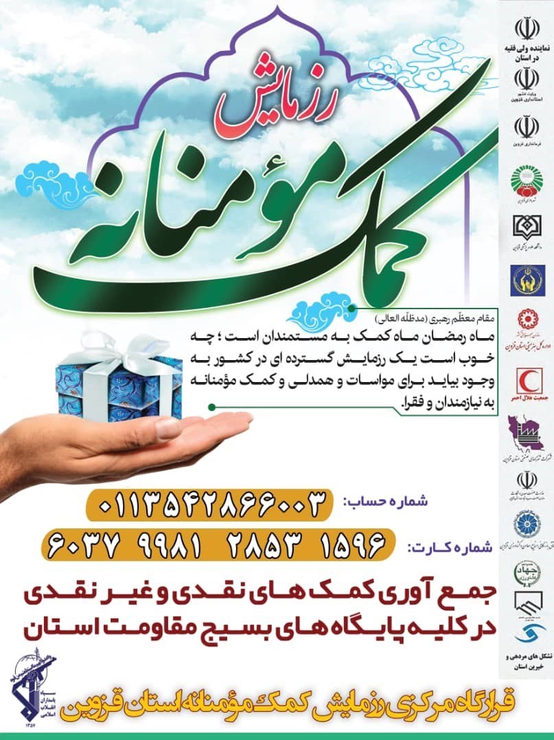 وی در انتها عنوان کرد: همچنین مردم و خیرین نیز میتوانند کمکهای مالی خود را به شماره حسابی که دفتر نماینده ولی فقیه در استان قزوین در فضاهای مجازی منتشر کرده است، واریز نمایند.