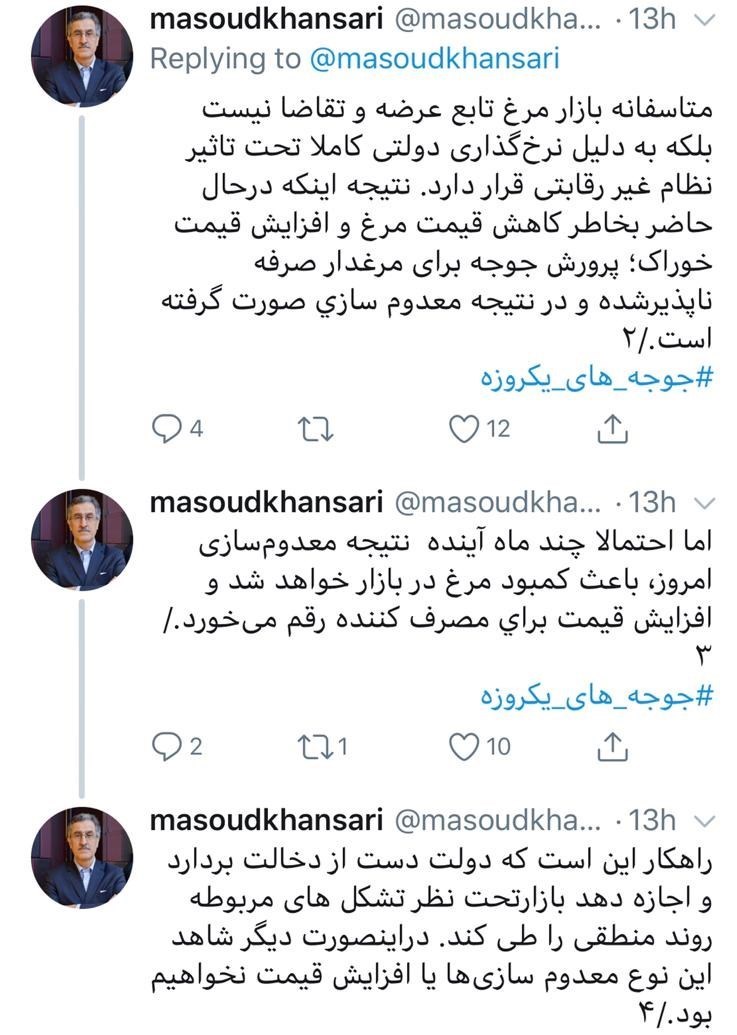 به گزارش خبرنگار اقتصادی خبرگزاری تسنیم،مسعود خوانساری در واکنش به خبر معدوم سازی جوجه های یک روزه در پیام توییتری نوشت: چند روزیست کلیپی در مورد از بین بردن جوجه های یک روزه در فضای مجازی منتشر شده و دیدن این صحنه ها مردم را آزرده خاطر کرده است. متاسفانه بازار مرغ تابع عرضه و تقاضا نیست بلکه به دلیل گذاری دولتی کاملا تحت تاثیر نظام غیر رقابتی قرار دارد.