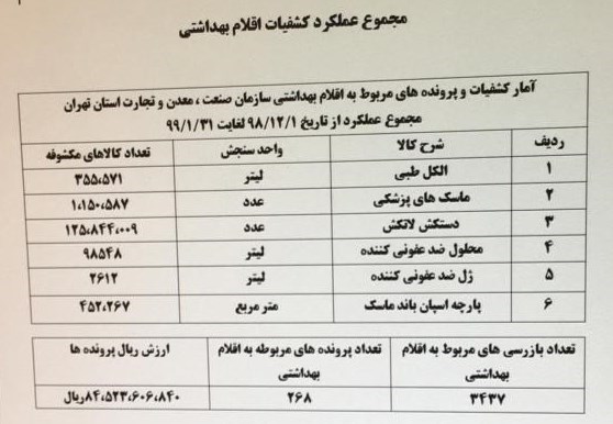 در همین راستا با ورود ویروس کرونا،سازمان صنعت استان تهران بازرسی های خود را شروع کرد و همچنان نیز ادامه دارد . میزان بازرسی های این سازمان در استان تهران از اول اسفند ماه سال گذشته تا پایان فروردین ماه سال ٩٩ تعداد ٣هزار و ٤٣٧مورد بوده که منجر به تشکیل ٢٦٨ پرونده شده و ارزش کشفیات اقلام بهداشتی در این بازرسی ها بیش از ٨میلیارد و 450 میلیون تومان بوده است.