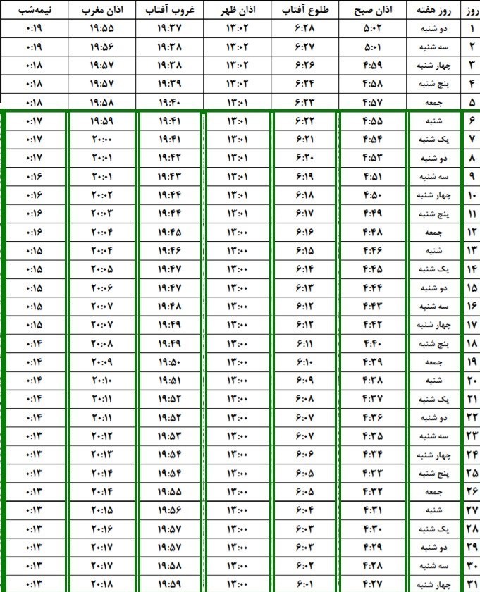 جدول اوقات شرعی اصفهان در ماه مبارک رمضان