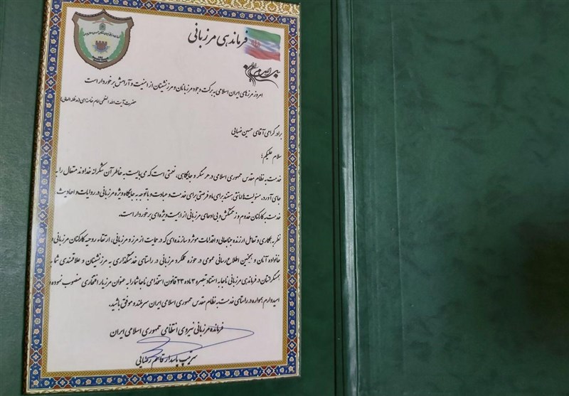 بر این اساس، وی به عنوان اولین خبرنگار در کشور با حکم فرمانده مرزبانی کشور سردار سرتیپ قاسم رضایی به این سمت منصوب شد و این حکم توسط فرمانده مرزبانی خراسان رضوی سردار جان نثار اهدا شد.