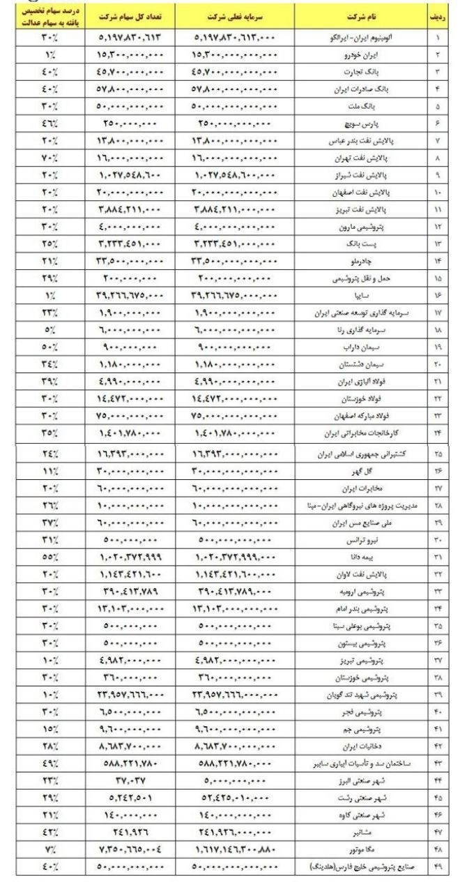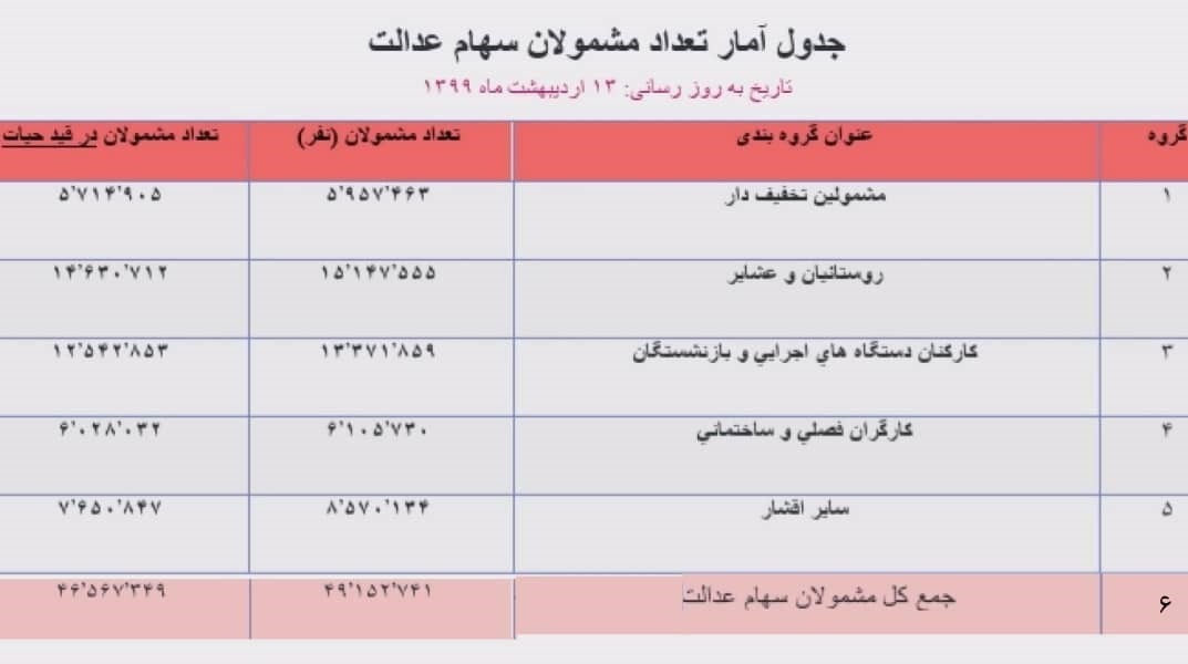 جدول آمار تعداد مشمولان سهام عدالت و شرکت‌های موجود در طرح سهام عدالت به شرح ذیل است: