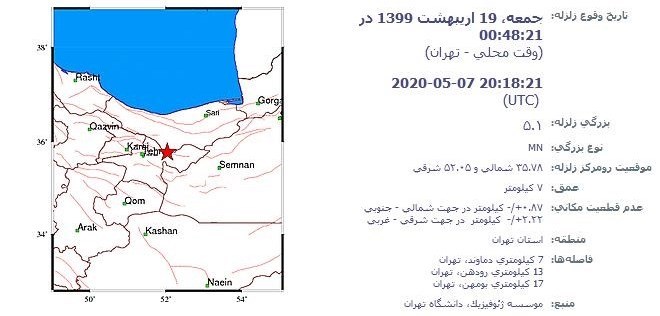 به گزارش خبرنگار اجتماعی خبرگزاری تسنیم، دقایقی پیش زلزلهای به بزرگای 5.1 ریشتر تهران و برخی شهرهای اطراف را لرزاند.