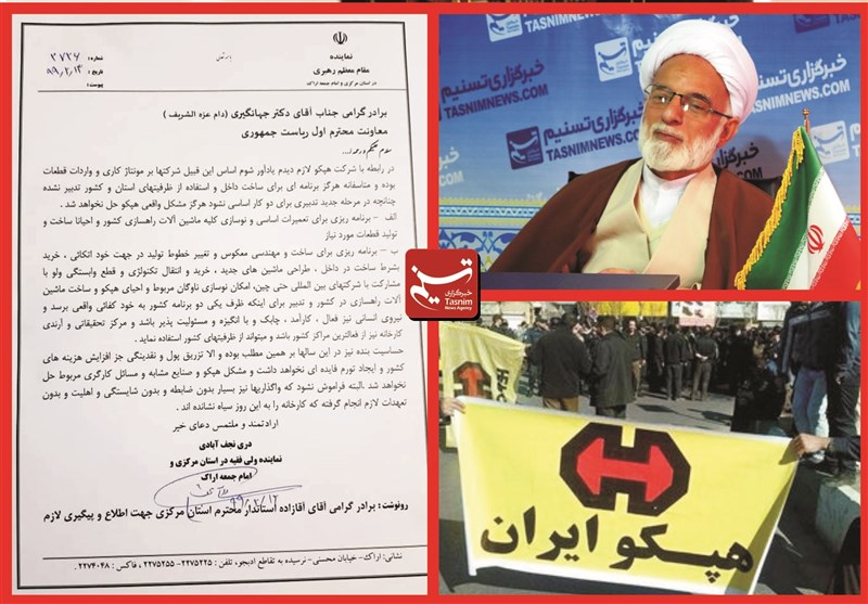 نماینده ولی فقیه در استان مرکزی و امام جمعه اراک در نامه به "اسحاق جهانگیری" معاون اول رئیس جمهور نکاتی را متذکر شده و اظهار داشته است: در رابطه با شرکت هپکو لازم دیدم یادآور شوم اساس این قبیل شرکتها بر مونتاژکاری و واردات قطعات بوده و متاسفانه هرگز برنامهای برای ساخت داخل و استفاده از ظرفیتهای استان و کشور تدبیر نشده چنانچه در مرحله جدید تدبیری برای دوکار اساسی نشود هرگز مشکل واقعی هپکو حل نخواهد شد.