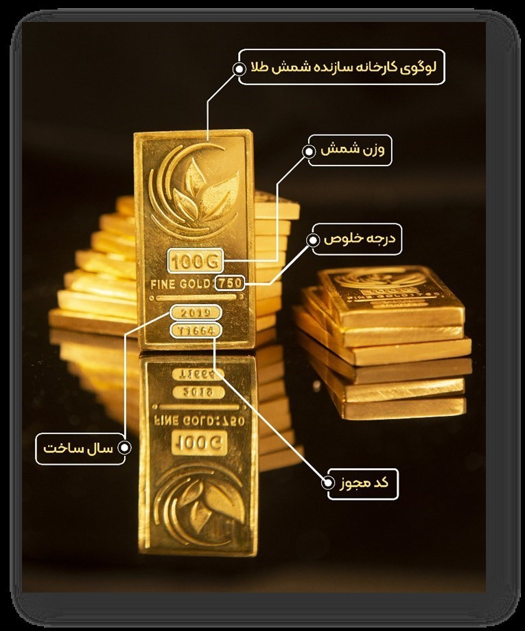 اسم شرکت سازنده در زمان ساخت روی آن حک می شود تا خریدار بتواند در زمان بروز هرگونه مشکل پیگیری لازم را انجام دهد. کارخانه سازنده نشان از اعتبار و ارزش آن است. وزن باید به صورت دقیق روی شمش حک شده باشد تا در صورتی که شمش را روی ترازوی مخصوص خود وزن کنید باید دقیقا همان عددی را نشان دهد که روی آن حک شده است. کارخانه سازنده شمش های 18 عیار را با درجه خلوص 750 بر روی شمش ها حک می کند. سال ساخت، نشان از سال تولید آن بوده و منظور از عدد T1664 کد مجوز ارائه شده توسط اتحادیه طلا و جواهرات کشور است.
