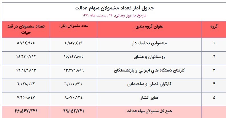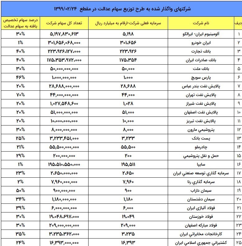 در این زمینه نگاهی به پرتفوی سهام عدالت در تاریخ 24 اردیبهشت ماه جاری اعلام شده توسط پایگاه اطلاع رسانی سهام عدالت نشان می‌دهد که در این سبد سهام 49 شرکت وجود دارد؛ شرکت هایی که عمدتا سهامشان در بورس اوراق بهادار تهران و فرابورس ایران قابل معامله است.
