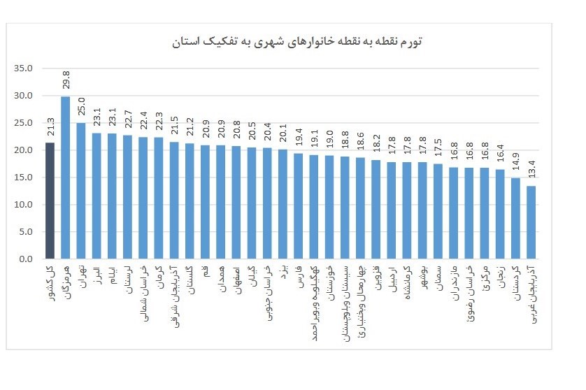 در اردیبهشت ماه ١٣٩٩ عدد شاخص کل برای خانوارهای شهری (100=١٣٩٥) به 208.7 رسید که نسبت به ماه قبل ٢.٦ درصد افزایش نشان میدهد. در این ماه بیشترین نرخ تورم ماهانه خانوارهای شهری مربوط به استان بوشهر با ٤.٦ درصد افزایش و کمترین نرخ تورم ماهانه مربوط به استان آذربایجان غربی با 0.3 درصد افزایش است. درصد تغییر شاخص کل نسبت به ماه مشابه سال قبل (تورم نقطه به نقطه) برای خانوارهای شهری کشور ٢١.٣ درصد است. بیشترین نرخ تورم نقطه به نقطه خانوارهای شهری مربوط به استان هرمزگان (٢٩.٨ درصد) و کمترین آن مربوط به استان آذربایجان غربی (١٣.٤ درصد) است. نرخ تورم دوازده ماهه منتهی به اردیبهشت ماه ١٣٩٩ برای خانوارهای شهری به عدد ٢٩.٧ درصد رسید . بیشترین نرخ تورم دوازده ماهه مربوط به استان ایلام (٣٥.٤ درصد) و کمترین آن مربوط به استان فارس (٢٥.٣ درصد) است.
