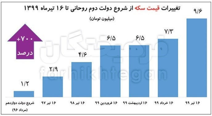 در این زمینه بررسی قیمت سکه نشان می‌دهد هر قطعه سکه تمام (جدید یا امامی) در اولین روزهای شروع دولت دوم روحانی (دولت دوازدهم) حدود یک میلیون و 218 هزار تومان بوده که با رشد 690 تا 700 درصدی این روزها در مرز 10 میلیون تومان در نوسان است.