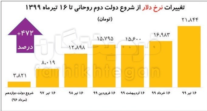 در این زمینه بررسی‌های آماری نشان می‌دهد پس از التهابات ارزی سال 1391 و 1392 وضعیت نرخ ارز تا حدودی با ترزیق ارز فیزیکی و کاهش سطح تحریم‌ها و... در دولت اول روحانی (یازدهم) به ثبات نسبی رسیده بود که از نیمه دوم سال 1396 وضعیت به کلی دگرگون شده و در سال 1397 نیز با خروج آمریکا از برجام و آغاز تحریم‌ها و در ادامه با سیاست‌های غلط مدیریت بازار ارز و همچنین شیوع ویروس کرونا، نرخ ارز بی‌سابقه‌ترین جهش را در طول چهار دهه به‌خود دیده است؛ به‌طوری که نرخ دلار آمریکا از حدود 3 هزار و 821 تومان در 14 مردادماه 1396 (شروع دولت دوازدهم) با رشد 472 درصدی به 21 هزار و 844 تومان تا لحظه نگارش این گزارش رسیده است. نکته قابل تامل اینکه، فقط در سه ماهه اخیر نرخ ارز 38 درصد رشد داشته و مقدار افزایش آن تقریبا معادل 63 درصد نرخ دلار در سال 1396 بوده است.