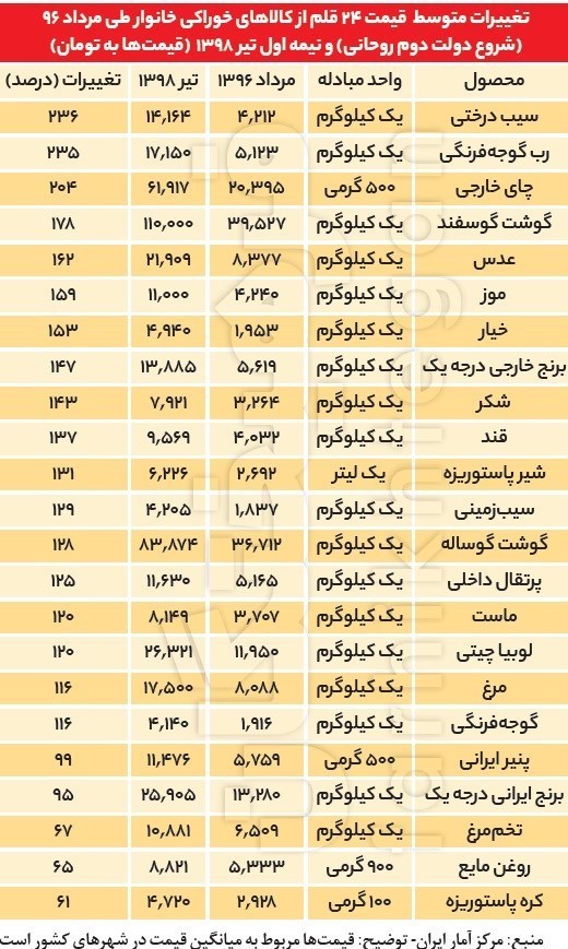 بررسی مقایسه‌ای قیمت‌ها در بخش اقلام خوراکی خانوار نشان می‌دهد در دولت دوازدهم قیمت اقلام ضروری خانوار رشد بی‌سابقه‌ای را تجربه کرده است، به‌طوری‌که مقایسه داده‌های آماری تغییرات متوسط قیمت 23 قلم از کالاهای خوراکی خانوار طی مرداد 96 و نیمه اول تیرماه 1398 نشان می‌دهد طی این مدت از 23 قلم بررسی‌شده، سه قلم رشد بیش از 200 درصدی داشته‌اند. در این گروه، سیب درختی با رشد 236 درصدی از حدود 4200 تومان به بیش از 14هزار تومان رسیده و رتبه اول را بین اقلام خوراکی دارد. پس از آن، رب گوجه‌فرنگی با رشد 235 درصدی از حدود پنج هزار تومان در مردادماه 96 به بیش از 17هزار تومان در هفته‌های اخیر رسیده است. چای خارجی نیز طی این مدت با رشد 204 درصدی، جایگاه سوم بیشترین افزایش قیمت در بین اقلام خوراکی را داراست.