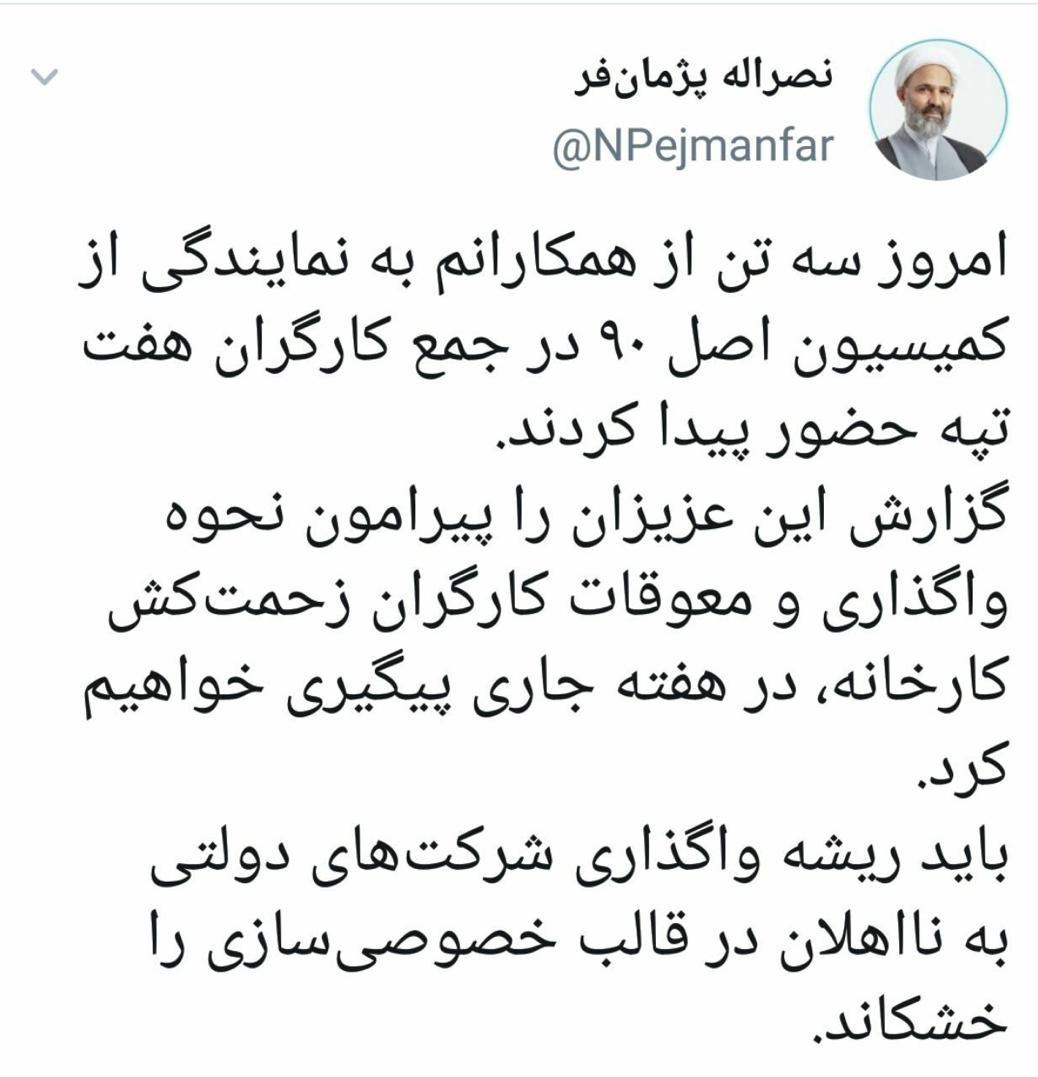 وی در این پیام نوشت: امروز سه تن از همکارانمبه نمایندگی از کمیسیون اصل نود در جمع کارگران هفت تپه حضور پیدا کردند. گزارش این  عزیزان را پیرامون واگذاری و معوقات کارگران زحمت کش کارخانه در هفته جاری پیگیری خواهیم کرد.