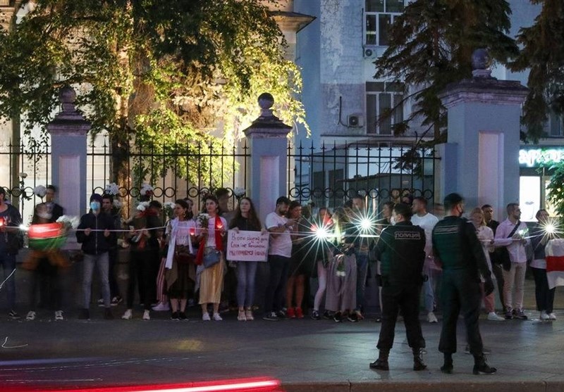 شرکت کنندگان زنجیره همبستگی در مقابل سفارت بلاروس تشکیل دادند. آنها علاوه بر گل، پوستر و روبان سفید، شمعهایی را به یاد مردی که چند روز قبل در اعتراضات مینسک جان خود را از دست داد، در دست داشتند. این تجمع اعتراض آمیز اواخر شب گذشته با آرامش به پایان رسید.