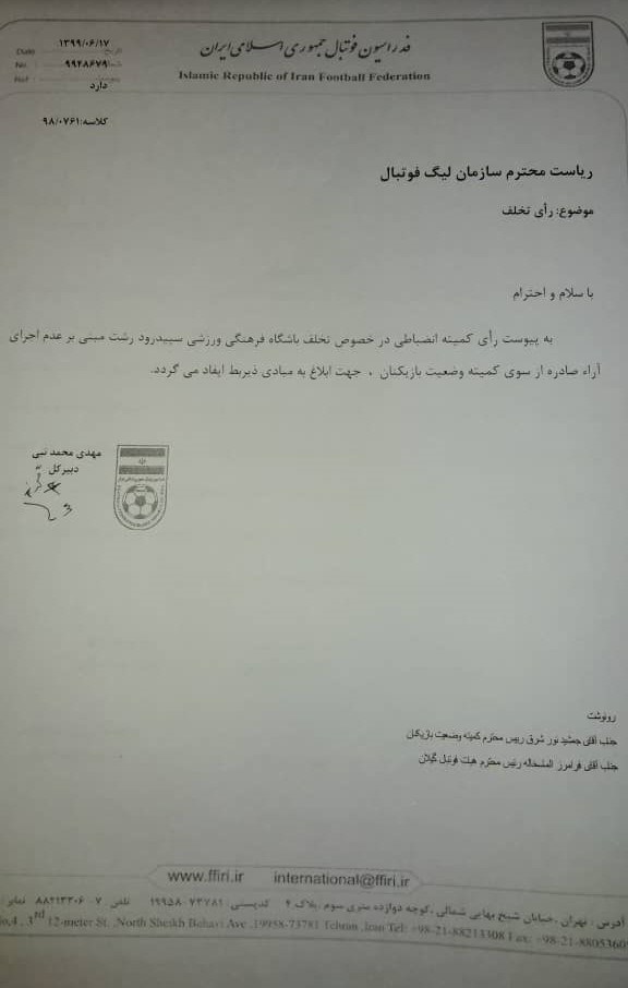 در بخشی از رای صادره کمیته انضباطی فدراسیون فوتبال ایران چنین آمده است: