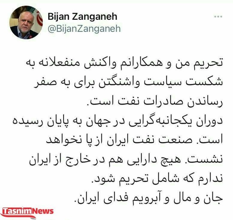 به گزارش خبرنگار اقتصادی خبرگزاری تسنیم، بیژن نامدار زنگنه وزیر نفت ایران در واکنش به قرار گرفتن نام خود در فهرست تحریمهای آمریکا نوشت: تحریم من و همکارانم واکنش منفعلانه به شکست سیاست واشنگتن برای به صفر رساندن صادرات نفت است.