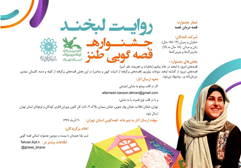 به گزارش خبرگزاری تسنیم، فاطمه تنهایی مدیرکل کانون پرورش فکری کودکان و نوجوانانِ استان تهران با اشاره به اهمیت تقویت روحیه امید و نشاط در شرایط کنونی و حضور بیشتر در منزل به منظور رعایت پروتکلهای بهداشتی گفت: نوجوانان (12 تا 18 سال) زنان و مردان 18سال به بالا و مادربزرگها و پدربزرگها میتوانند در دوبخش قصههای امروز: با لبخند در خانه بمانیم (خاطرات و تجربیات طنزآمیز) و قصههای دیروز: از گذشته لبخند سوغات بیاوریم. (قصههای برگرفته از ادبیات کهن و معاصر که برگرفته از کلیله و دمنه، گلستان سعدی، مرزباننامه است پیشنهاد میشود.