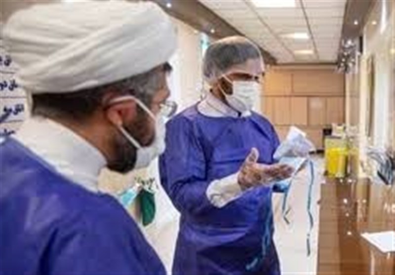شاید در گمان اول فکر کنید او یک پرستار است اما خوب که به چهره او نگاه میکنی، عمامه سفیدی را بر سرش میبینی آری او طلبه جهادی است که در بخش بیماران کرونایی حضور دارد تا به بیماران و کادر درمان کمک کند.