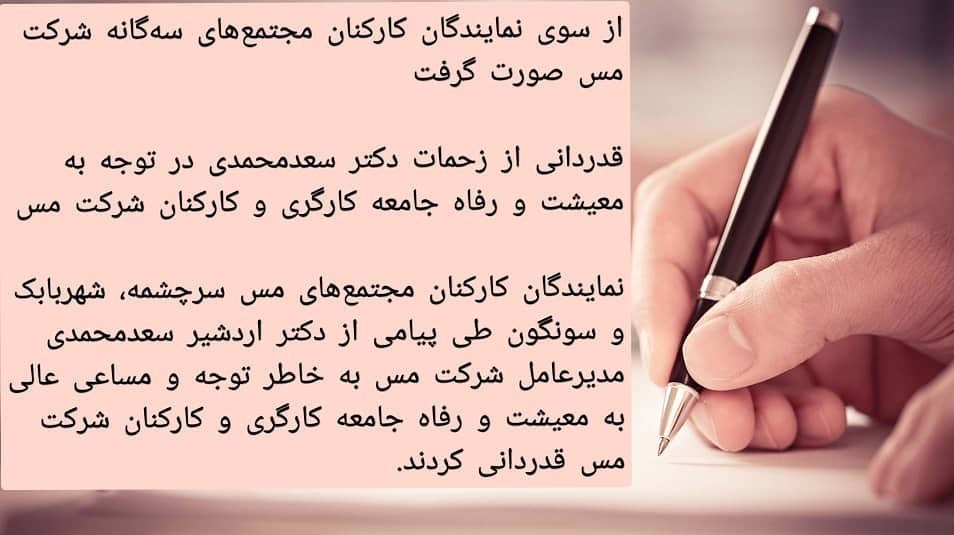 نمایندگان کارکنان مجتمع‌های مس سرچشمه، شهربابک و سونگون طی پیامی از اردشیر سعدمحمدی مدیرعامل شرکت مس به خاطر توجه و مساعی عالی به معیشت و رفاه جامعه کارگری و کارکنان شرکت مس قدردانی کردند.