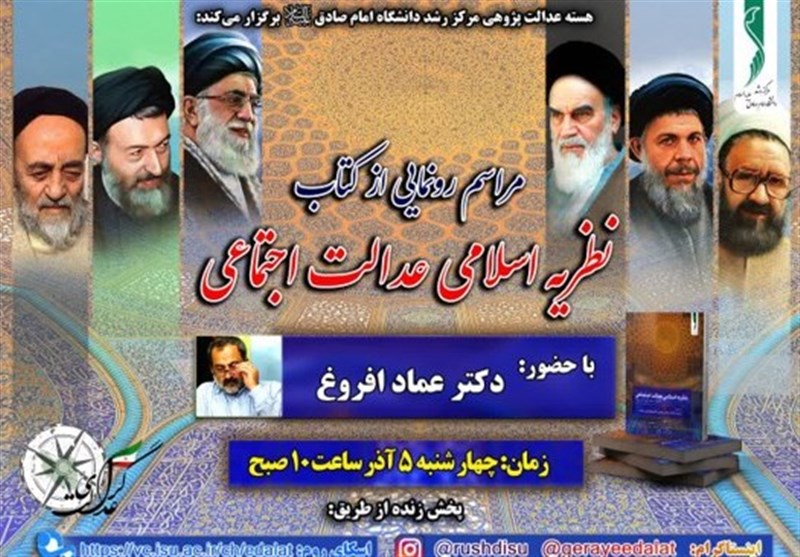 در این راستا به همت مرکز رشد دانشگاه امام صادق(ع)، نشست رونمایی و بررسی کتاب «نظریه اسلامی عدالت اجتماعی» نوشته چهار نفر از پژوهشگران هسته عدالتپژوهی مرکز رشد با حضور «عماد افروغ» برگزار میشود. این کتاب توسط انتشارات دانشگاه امام صادق(ع) و در 347 صفحه منتشر شده و به آراء و اندیشههای شش متفکر دینی معاصر پیرامون عدالت اجتماعی میپردازد و در فصل پایانی، صورتبندی جدیدی از نظریه اسلامی عدالت اجتماعی را مبتنی بر دیدگاه متفکران دینی معاصر ارائه میدهد.
