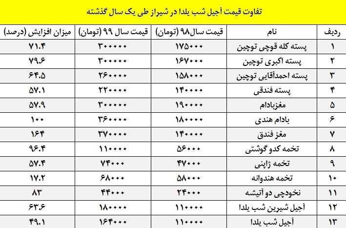 مقایسه قیمت انواع آجیل و خشکبار شب یلدا 99 با سال گذشته تایید کننده افزایش قیمت این اقلام است. مغز فندق با افزایش 164 درصدی نسبت به سال گذشته در صدر افزایش قیمتها است و تخمه هندوانه نیز با افزایش 17.2 درصدی کمترین افزایش قیمت را به خود اختصاص داده است.