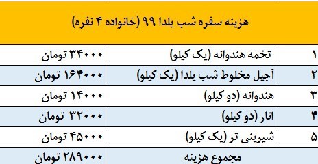 با این تفاسیر یک خانواده چهار نفره شیرازی بدون در نظر گرفتن هزینه شام، سفره شب یلدای خود را با 289 هزار تومان هزینه پهن میکنند.