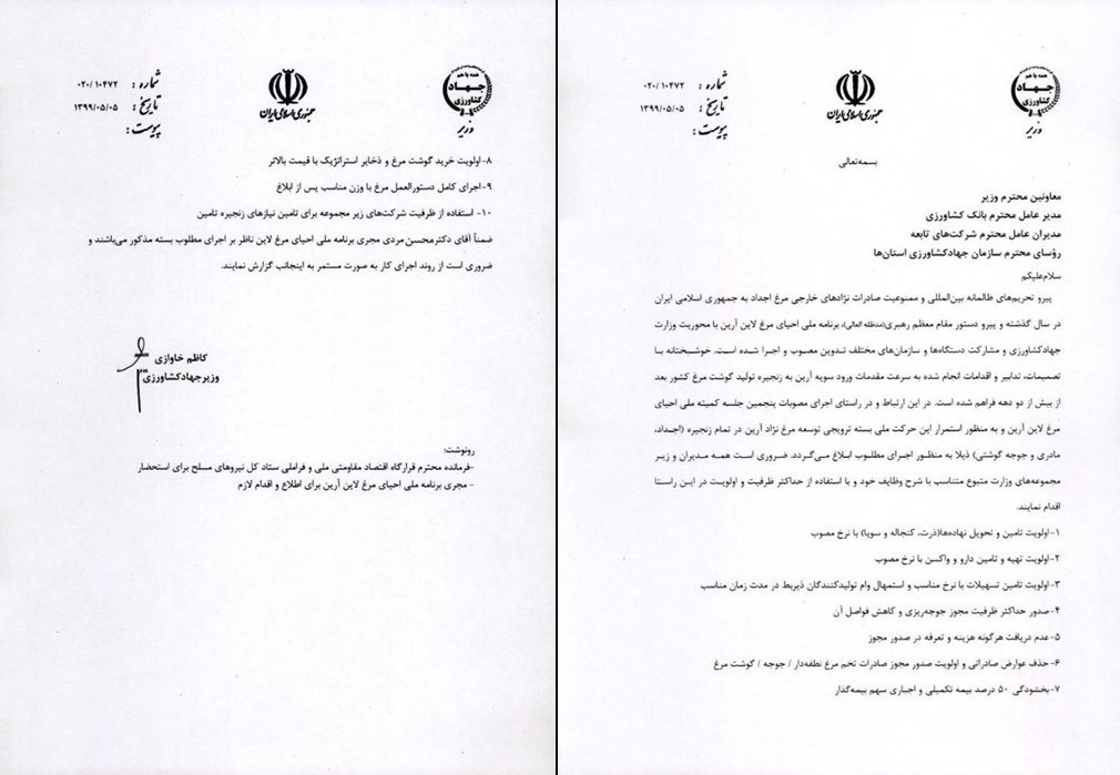 بسته های حمایتی ویژه وزارت جهاد کشاورزی، برای پرورش دهندگان مرغ آرین