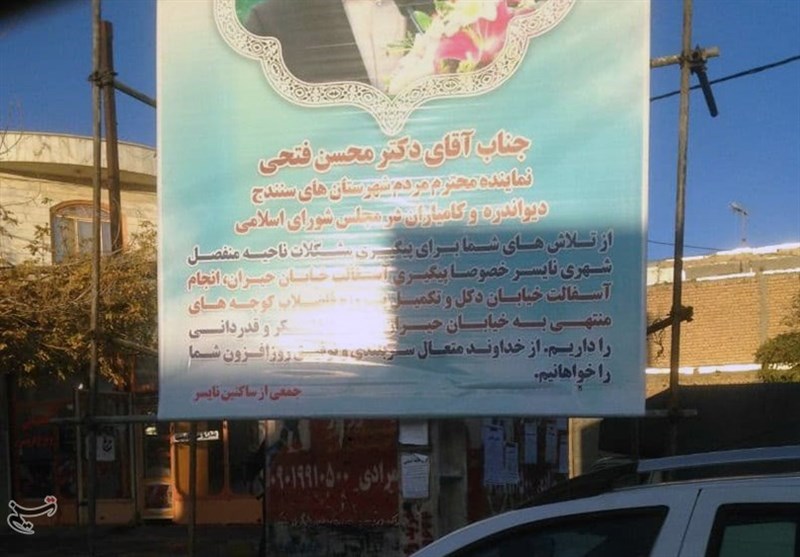 به گزارش خبرگزاری تسنیم از سنندج، درست زمانی که محسن فتحی نماینده مردم شهرستانهای سنندج، دیواندره و کامیاران در مجلس شورای اسلامی بنر فدایت شومی را از تلاشهای خود برای پیگیری مشکلات ناحیه منفصل شهری نایسر بهویژه پیگیری آسفالت خیابان حیران، انجام آسفالت خیابان دکل و تکمیل پروژه فاضلاب کوچههای منتهی به خیابانهای نایسر را از جانب جمعی از اهالی چاپ و بر سر پرترددترین چهارراه نایسر نصب میکند، مردم این ناحیه منفصل شهری روزگار خود را در گِل و لایی سر میکنند که به گفته نماینده این شهر مدتهای مدیدی از آسفالت آن گذشته و من باب تشکر این بنر بر سر کوچه نصب شده است.