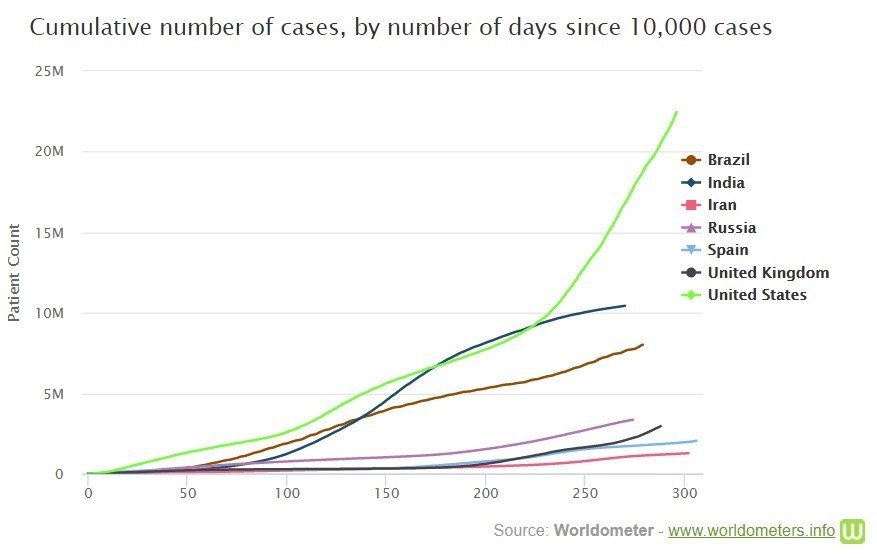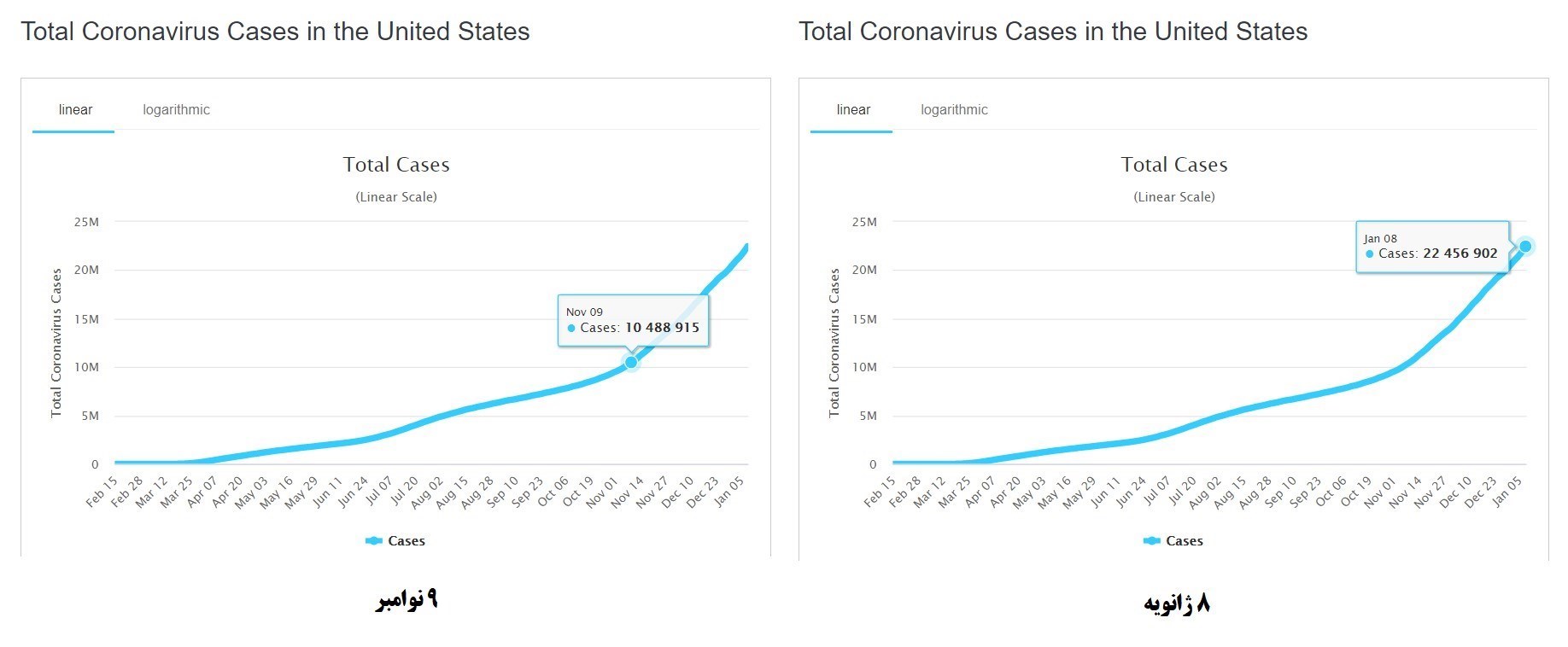 کشور آمریکا با وجود ساخت و تزریق واکسن، نمودار مطلوبی را در زمینه ابتلا و مرگ و میر مرتبط با ویروس کرونا تجربه نمی‌کند. این کشور تا لحظه تنظیم گزارش کرده است که حدود 22 و نیم میلیون نفر مورد مبتلا به کرونا داشته است.