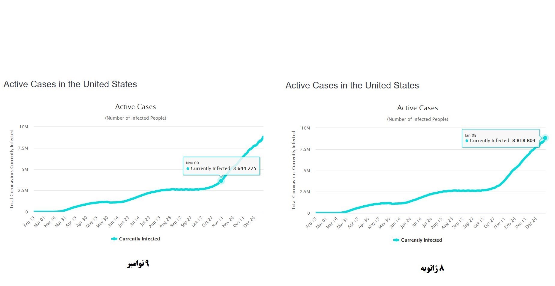از ابتدای شیوع کرونا در آمریکا تا 9 نوامبر (زمان اعلام ساخت واکسن شرکت فایزر)، 10 میلیون و 488 هزار و 915 نفر مبتلا شده بودند. اما فقط طی دو ماه پس از ساخت در این کشور حدود 12 میلیون بر شمار مبتلایان در این کشور افزوده شده است. در تاریخ 8 ژانویه (روز گذشته) تعداد مجموع مبتلایان در آمریکا 22 میلیون و 456 هزار و 902 نفر اعلام شد. عجیب آنکه پس از ساخت کرونا در آمریکا نمودار ابتلا به کرونا در این کشور، شیب تندتری را به خود گرفته است.