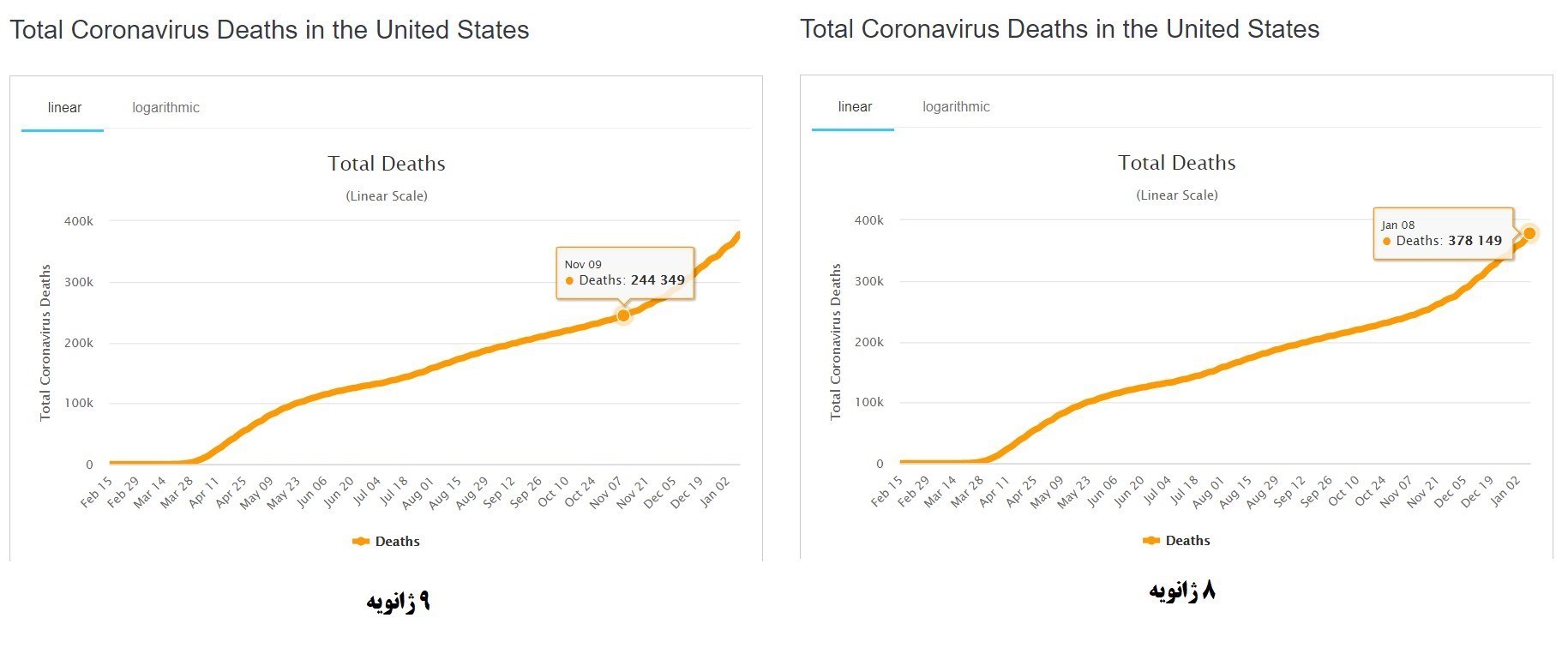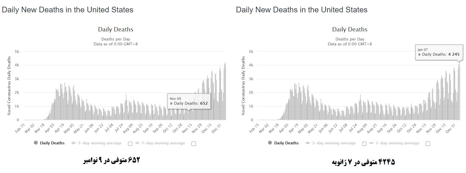 میزان مرگ و میر مربوط به کرونا هم در آمریکا روند صعودی داشته است و پس از ساخت واکسن در این کشور سرعت افزایش آن بالاتر رفته است. از ابتدای شیوع کرونا تا 9 نوامبر 244 هزار و 349 نفر بر اثر کرونا در آمریکا جان باخته بودند که این رقم در 8 ژانویه به 378 هزار و 149 نفر رسید.