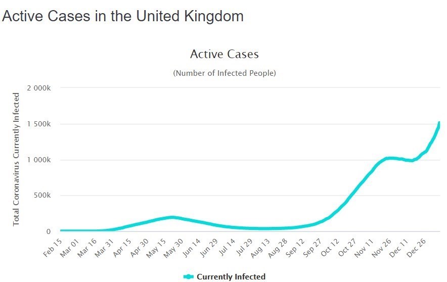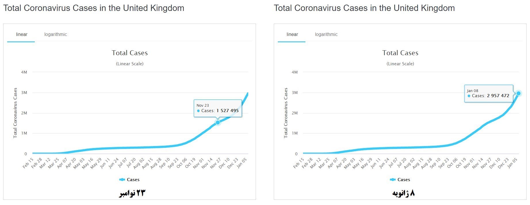 البته کشور انگلیس تزریق واکسن را با واکسن‌های فایزر و مدرنا آغاز کرد و به تازگی از واکسن‌های آکسفورد هم استفاده می‌کند. در هر حال، نمودار مربوط به مبتلایان کرونا در انگلیس طی دو ماه گذشته شیب تندتری را به خود گرفته است. به نظر می‌رسد که بخشی از تندتر شدن شیب مربوط به جهش ویروس کرونا در انگلیس است که دلیل این جهش مشخص نیست.