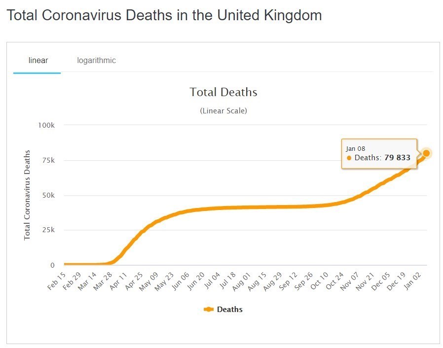 آمار مرگ و میر در انگلیس که از اوایل ماه می تا اواخر ماه اکتبر به حالت ثابتی رسیده بود، از اوایل ماه نوامبر سرعت قابل توجهی را به خود گرفته است. مجموع کسانی که بر اثر کرونا جان خود را در انگلیس از دست داده‌اند تا 8 ژانویه (دیروز) به 79 هزار 833 نفر رسید.