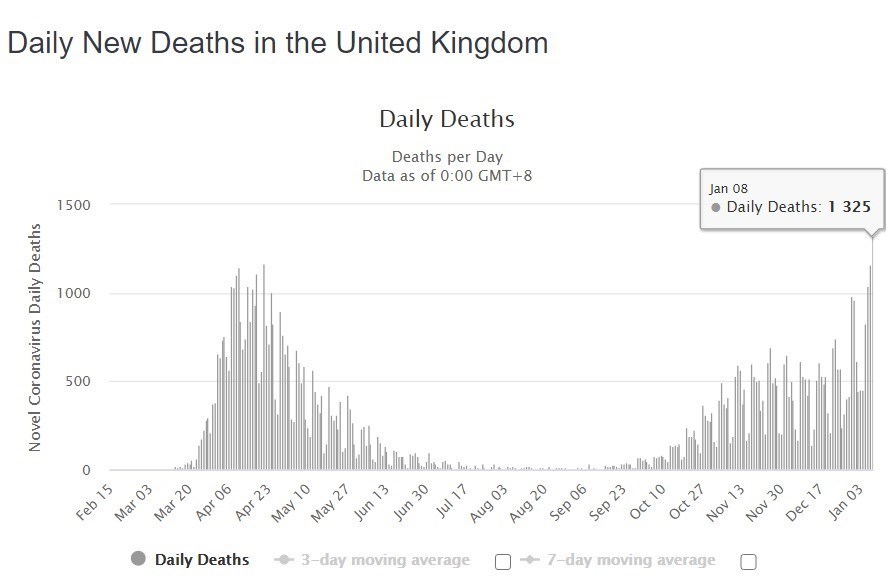 آمار مرگ و میر روزانه بر اثر کرونا در 8 ژانویه نیز افزایش محسوسی پیدا کرده و همانطور که نمودار زیر نشان می‌دهد به یک هزار و 325 نفر رسید.