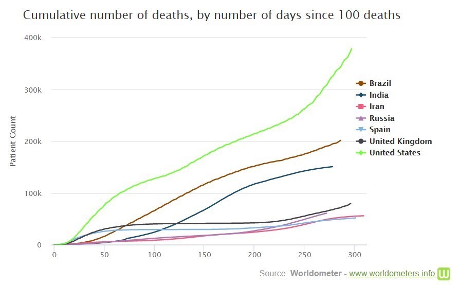 نمودار زیر مقایسه میزان ابتلای به کرونا در چندین کشور را نشان می‌دهد. رنگ سبز مربوط به آمریکا و رنگ مشکی مربوط به آمار کشور انگلیس هست که نمودار آنها اخیرا شیب تندتری را به خود گرفته است.