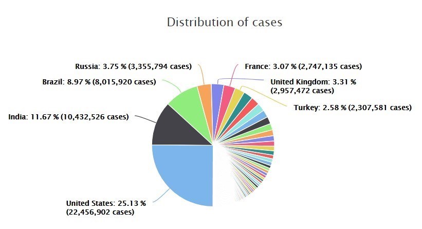 همانطور که نمودار زیر نشان می‌دهد، بیش از 25 درصد موارد مبتلا شده به کرونا فقط در کشور آمریکا هستند.