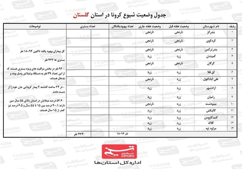 تازه‌ترین وضعیت شیوع کووید 19 در استان گلستان| وضعیت نارنجی در 6 شهرستان/ 18 هزار بیمار کرونایی تا کنون بهبود یافتند + جدول