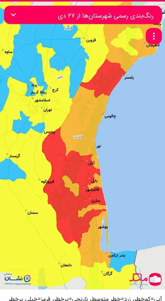 به گزارش خبرگزاری تسنیم از ساری، براساس آخرین اعلام وزارت بهداشت و وضعیت رنگبندی رسمی شهرستانها، هم اکنون در استان مازندران شهرستانهای نکا، ساری، قائمشهر، سوادکوه، بابل، فریدونکنار، آمل، تنکابن و رامسر در وضعیت قرمز کرونایی قرار گرفتهاند و مابقی شهرستانهای استان در وضعیت نارنجی قرار دارند.