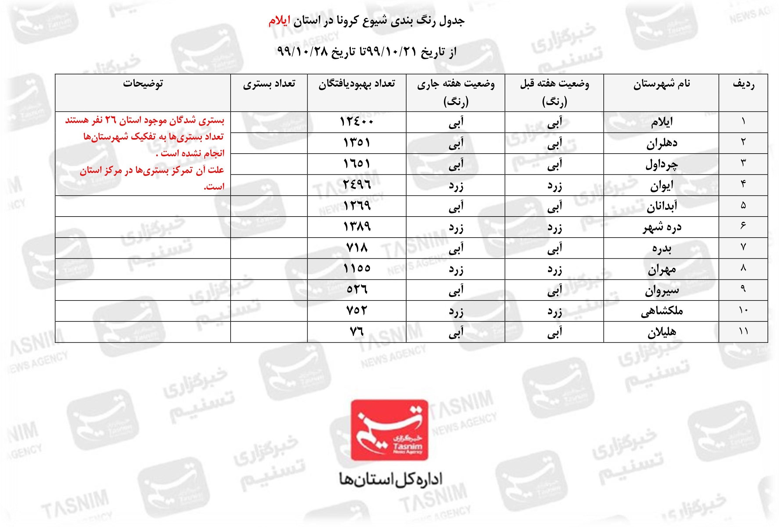 بررسی آماری در زمان تعیین شده( 21 دیماه 99 تا 28 دیماه 99) نشان از آن دارد که 7 شهرستان استان در وضعیت آبی و 5 شهرستان دیگر در وضعیت زرد قرار دارد .