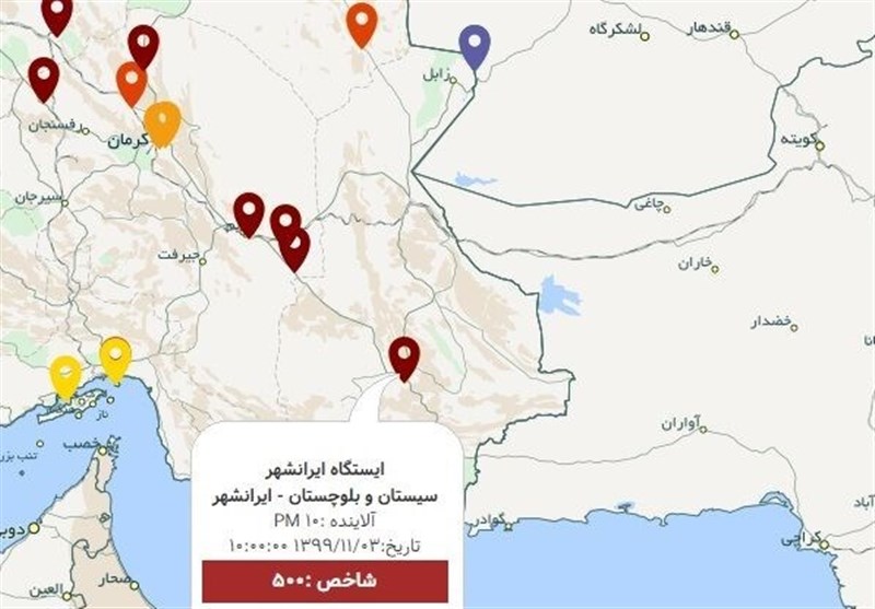 به گزارش خبرگزاری تسنیم از زاهدان، به نقل از روابط عمومی ادارهکل حفاظت محیط زیست سیستان و بلوچستان، سامانه پایش کیفی هوای سازمان محیط زیست اعلام کرد که ساعت 10 صبح امروز جمعه میزان آلاینده 10 میکرون ذرات معلق در هوای ایرانشهر حداقل به 500 واحد معادل 3.2 برابر حد مجاز رسید و شرایط کیفی هوا را برای تمام گروههای سنی "خطرناک" کرد.