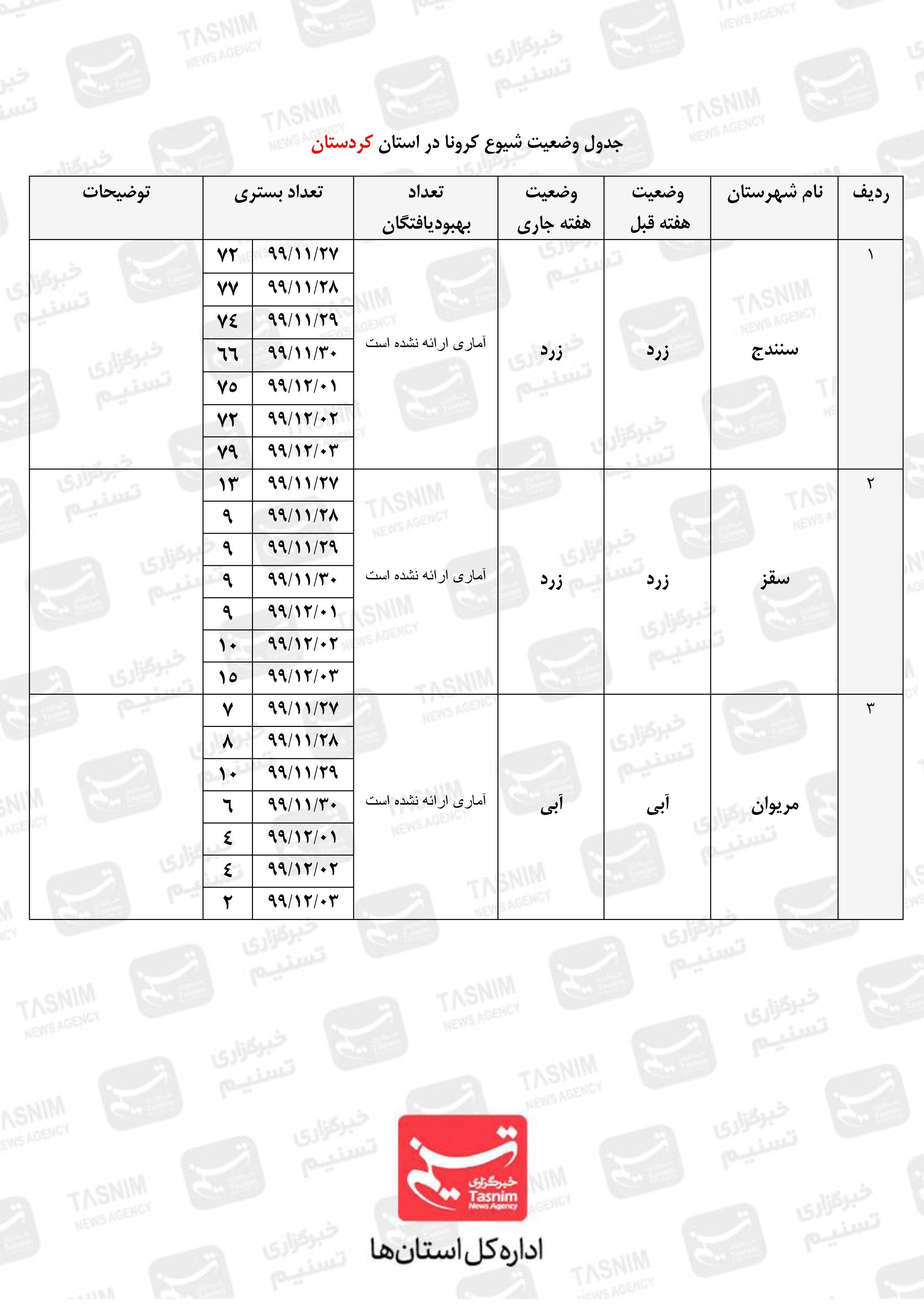 در ادامه جدولی از وضعیت و آمار مبتلایان به کرونا به تفکیک شهرستانهای استان کردستان از روز 27 بهمن تا 3 اسفند ماه جاری را میبینید: