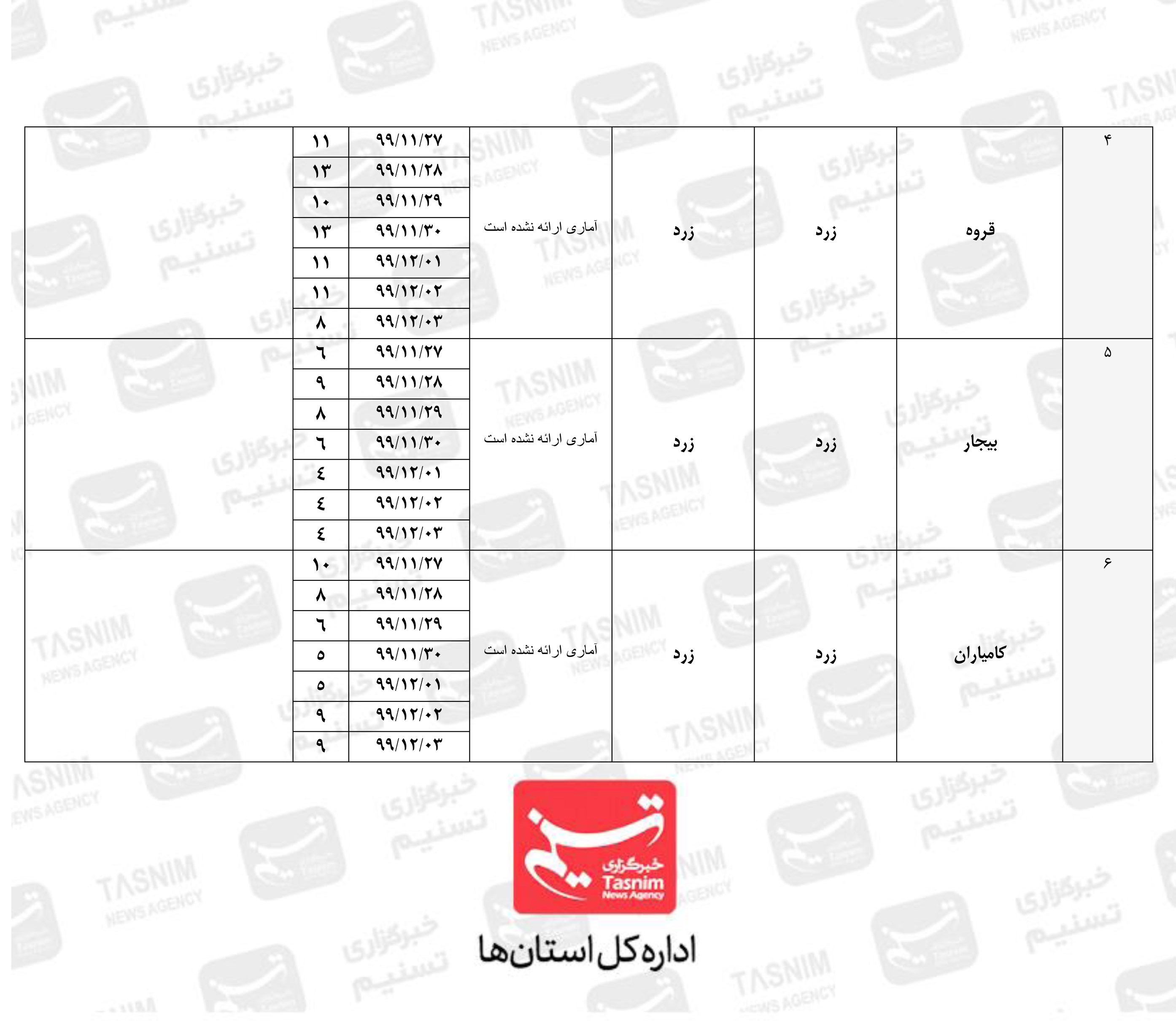 به گزارش خبرگزاری تسنیم از سنندج ، براساس آخرین وضعیت اعلام شده توسط وزارت بهداشت، وضعیت شهرستانهای بانه، بیجار، سقز، سنندج، کامیاران و قروه به دلیل سادهانگاری و عدم رعایت پروتکلهای بهداشتی از 23 بهمن ماه از رنگ آبی (کم خطر) به رنگ زرد (خطر متوسط) بازگشته و خوشبختانه شهرستانهای سروآباد، دیواندره، دهگلان و مریوان همچنان در وضعیت آبی قرار دارند.