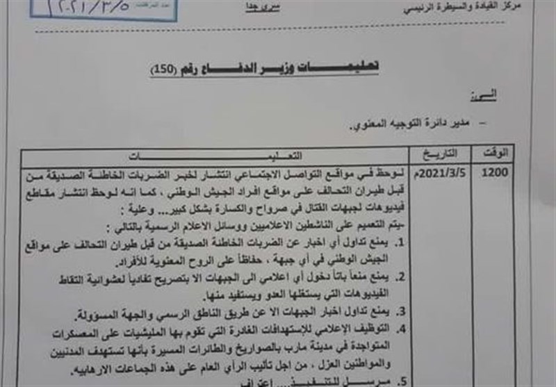 کاربران در شبکه‌های اجتماعی از بیانیه دفتر «محمد المقدشی» وزیر دفاع دولت دست‌نشانده سعودی در یمن خبر دادند که در آن دستور داده شده است که به هیچ وجه بمباران نیروهای خودی به‌دست جنگنده‌های ائتلاف سعودی مخابره نشود.