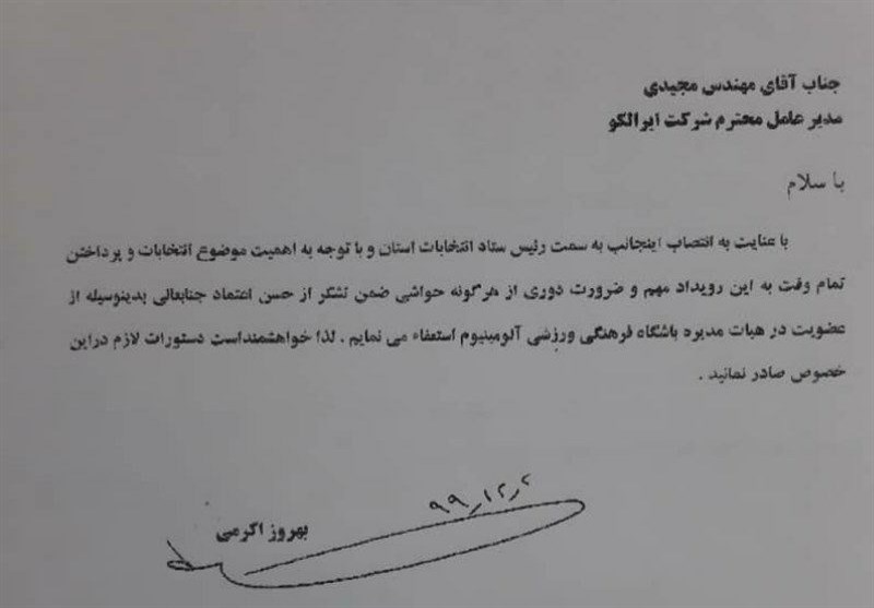 اکرمی در نامه استعفای خود خطاب به مدیرعامل شرکت آلومینیوم ایران آورده است: باعنایت به انتصاب اینجانب به سمت رئیس ستاد انتخابات و با توجه به اهمیت موضوع انتخابات و پرداختن تماموقت به این رویداد مهم و ضرورت دوری از هرگونه حواشی ضمن تشکر از حسن اعتماد جنابعالی بدینوسیله از عضویت در هیئت مدیره باشگاه فرهنگی ورزشی آلومینیوم استعفا مینمایم. خواهشمند است دستورات لازم در این خصوص صادر نمایید.