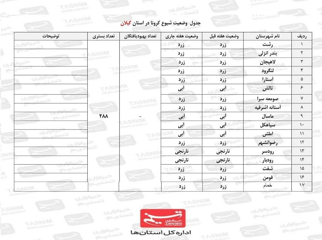 لازم به ذکر است که وضعیت شهرستانهای استان گیلان هفته گذشته نیز به همین منوال بوده و در رنگبندی شهرستانها تغییری ایجاد نشده است.