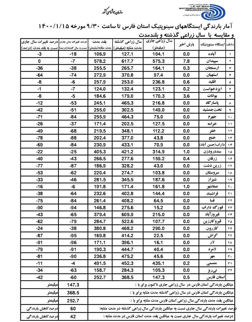 براساس آمار اعلام شده از سوی هواشناسی استان فارس تا صبح 15 فروردین ماه میانگین بارندگی استان در سال زراعی  147.3 میلی‌متر بوده است در حالی که در سال گذشته در همین زمان میانگین بارندگی 368.5 میلی‌متر بوده که کاهش بیش از 50 درصد را نشان می‌دهد.
